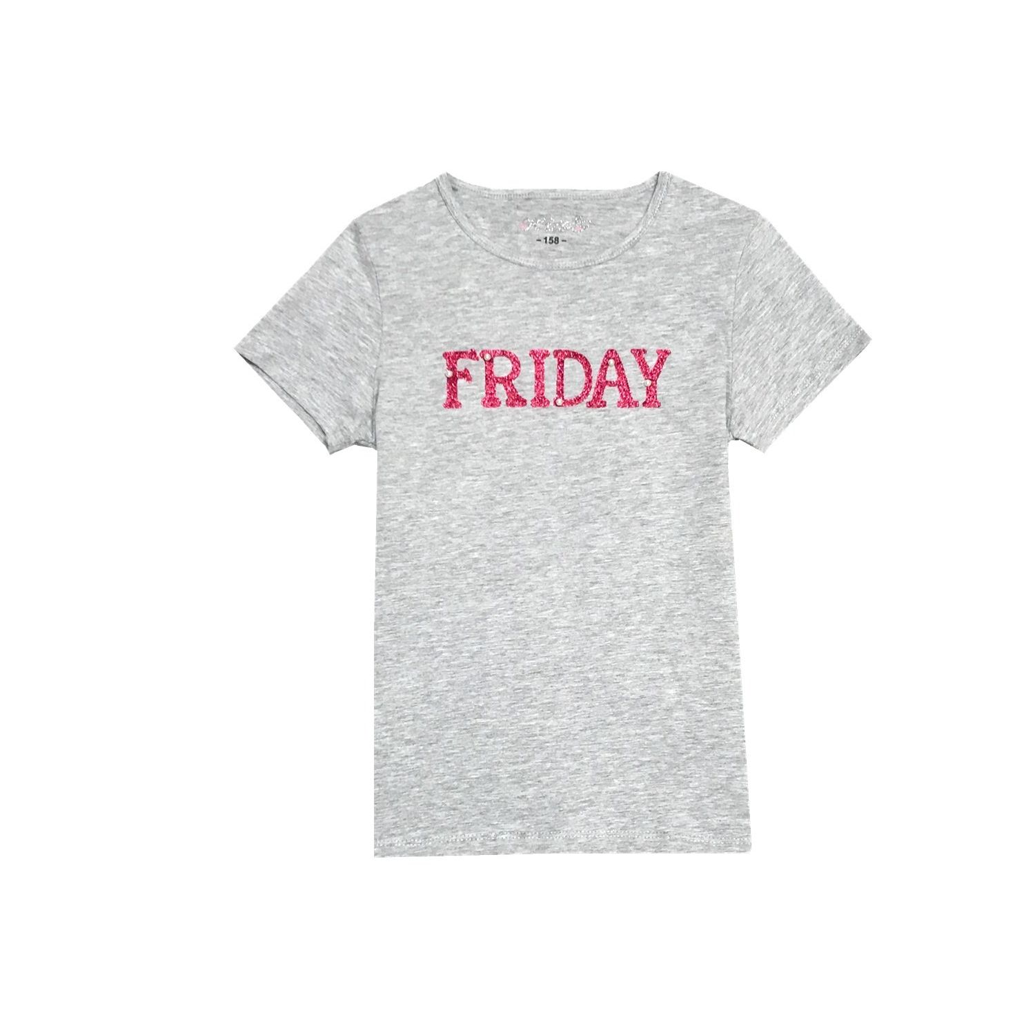 Dívčí bavlněné tričko, v pase trošičku projmuté, vpředu s třpytícím se nápisem dne v týdnu, který je ozdobený perličkami.