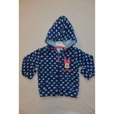 Flísová mikinka pro naše nejmenší princezničky. Je měkoučká a hřejivá. Je tmavě modré barvy se světle modrými srdíčky. V kapucce je bavlněná světle modrá podšívka. Mikinka se zapíná na zip, je ozdobená našitým obrázkem Minnie, vpředu má 2 kapsičky.